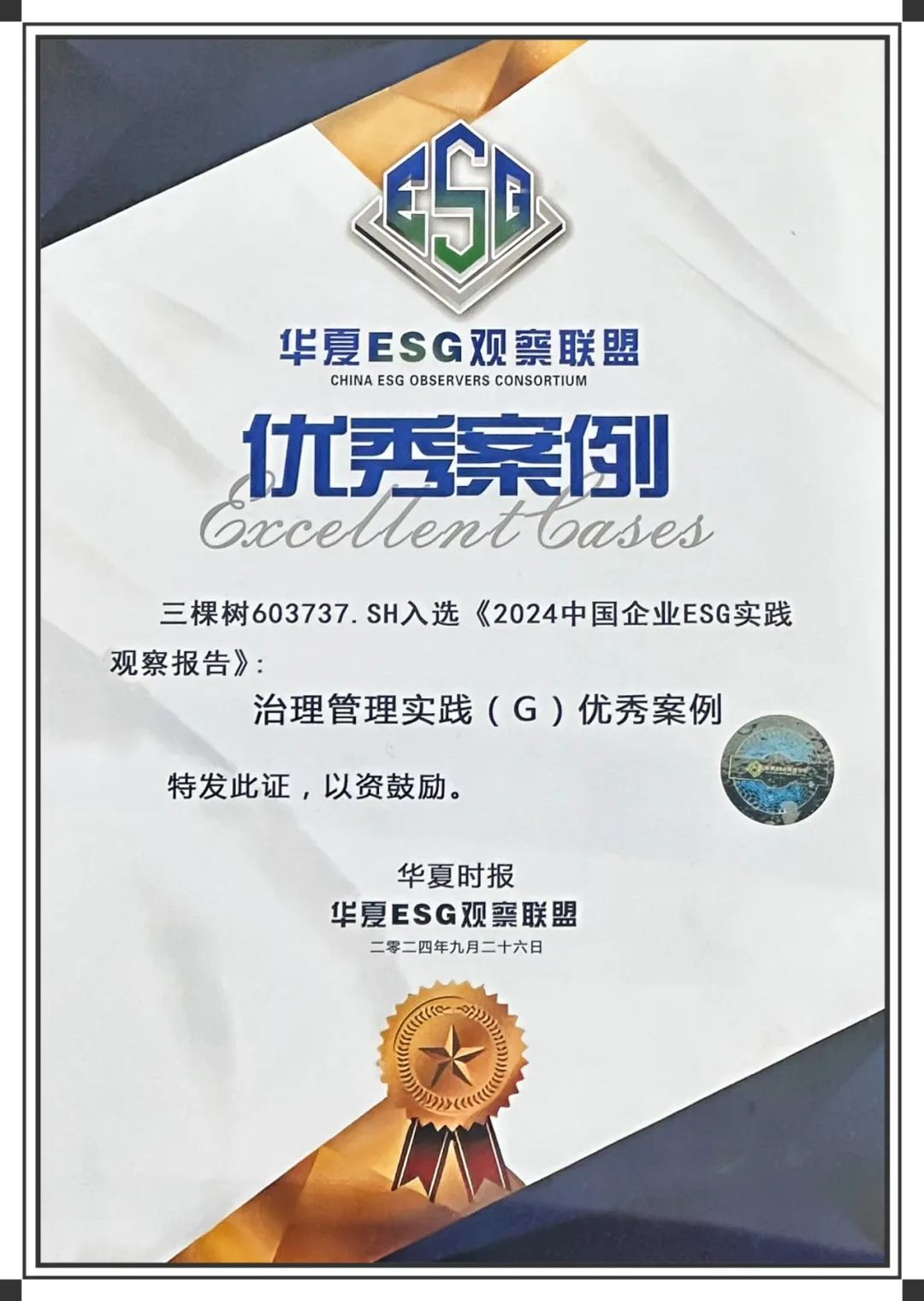 三棵树获评2024上市公司ESG“治理管理实践(G)优秀案例”