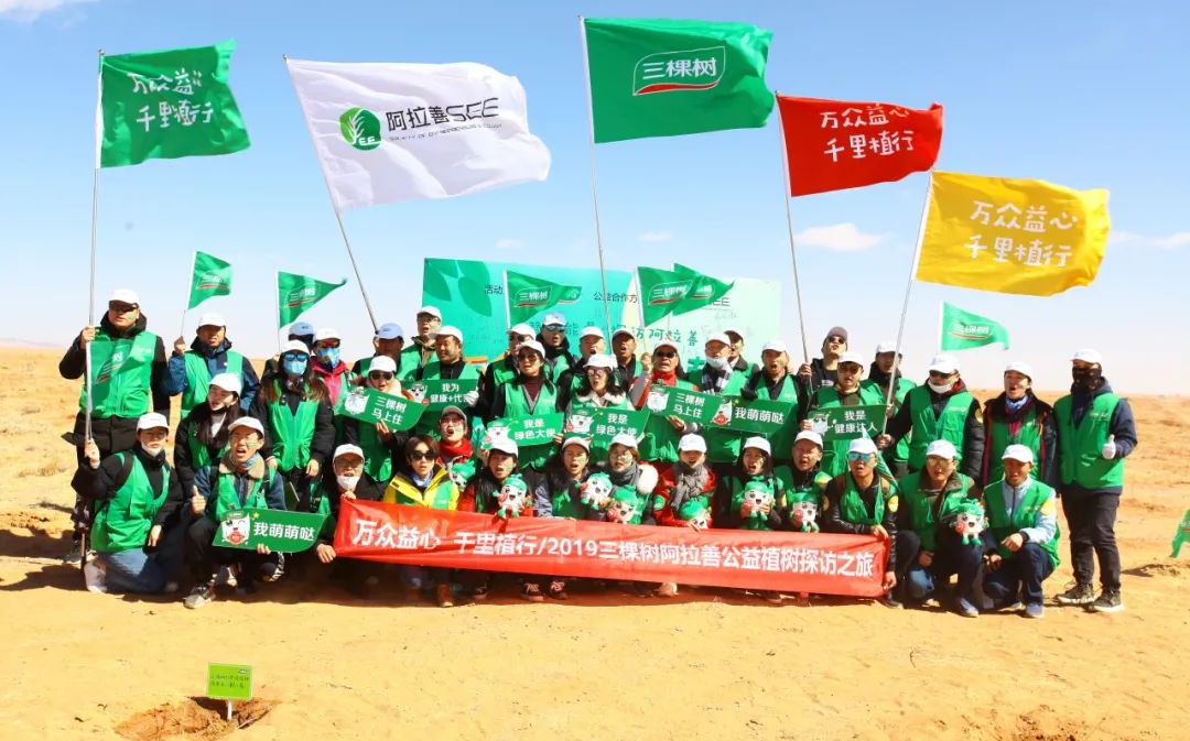 2016年起,三棵树每年定向捐赠支持“一亿棵梭梭”项目,种植以梭梭为主体的荒漠植被,为阿拉善筑起800公里的绿色屏障,连续多年组织员工、合作伙伴和消费者前往阿拉善三棵树公益林开展梭梭树植树探访活动。