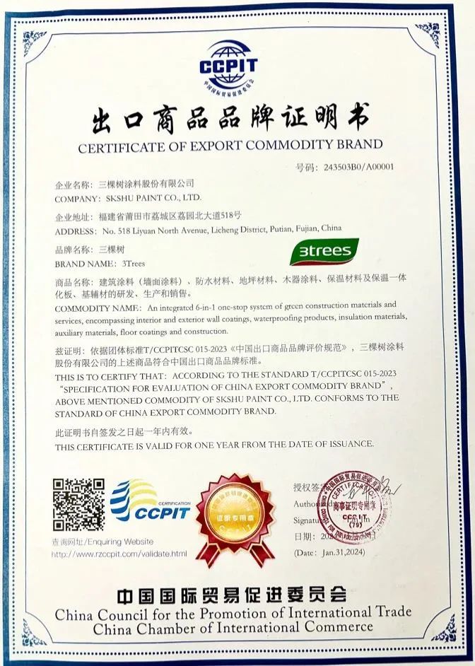 Start the new year with a sprint, and make new advances in the Year of the Loong. On the afternoon of February 29, Lin Shaowen, Deputy Mayor of PutianCity, issued the city's first “Certificate of Export Commodity Brand” to SKSHU Paint Co., Ltd. (3TREES for short) at the Municipal Government Service Center.
